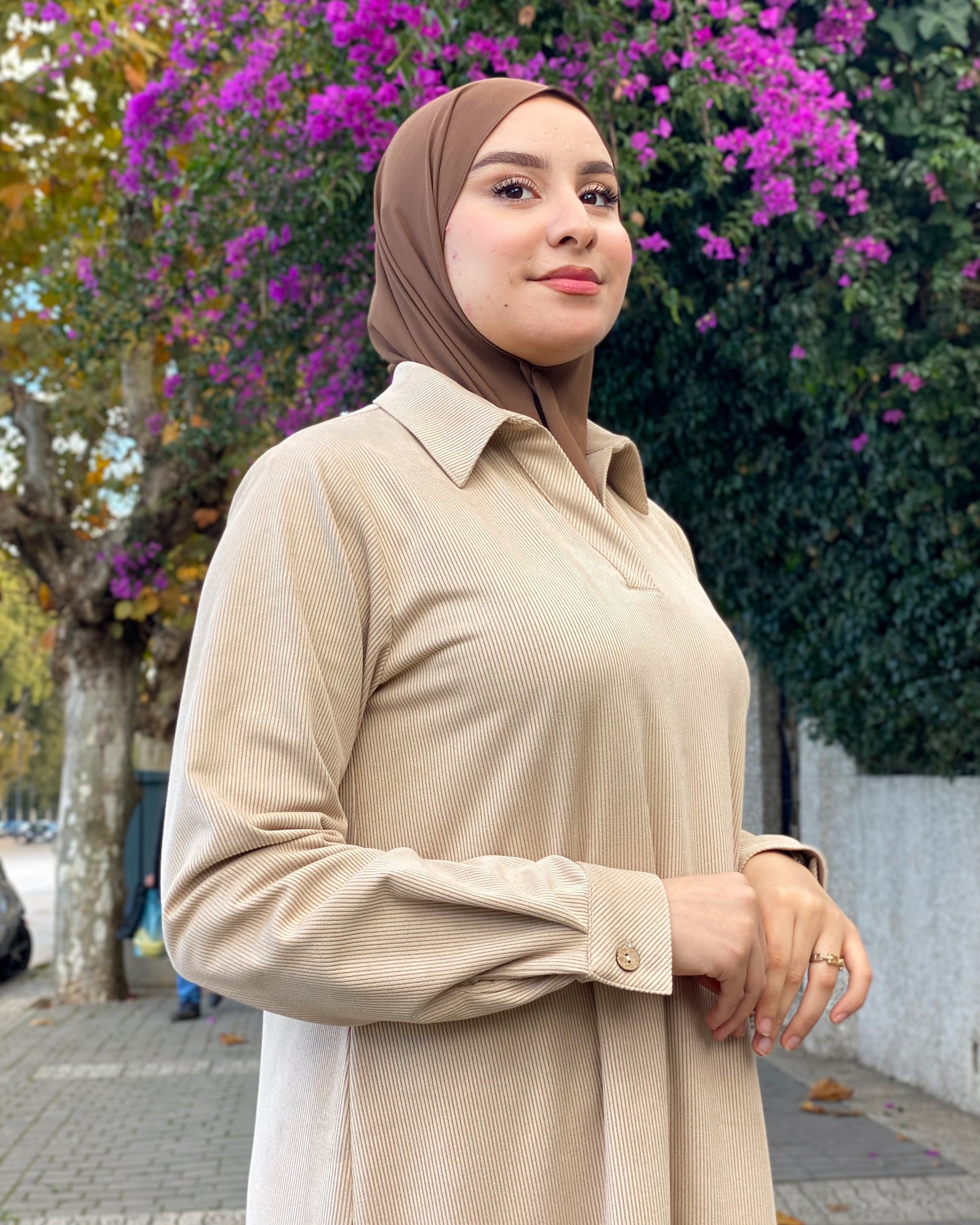 Ce manteau en tissu Bouclette, d'une couleur chocolat chaud et distinctive, ajoute une touche d'élégance à votre look de jour. Il se marie parfaitement avec une robe en velours beige, créant ainsi une combinaison chaleureuse et élégante.