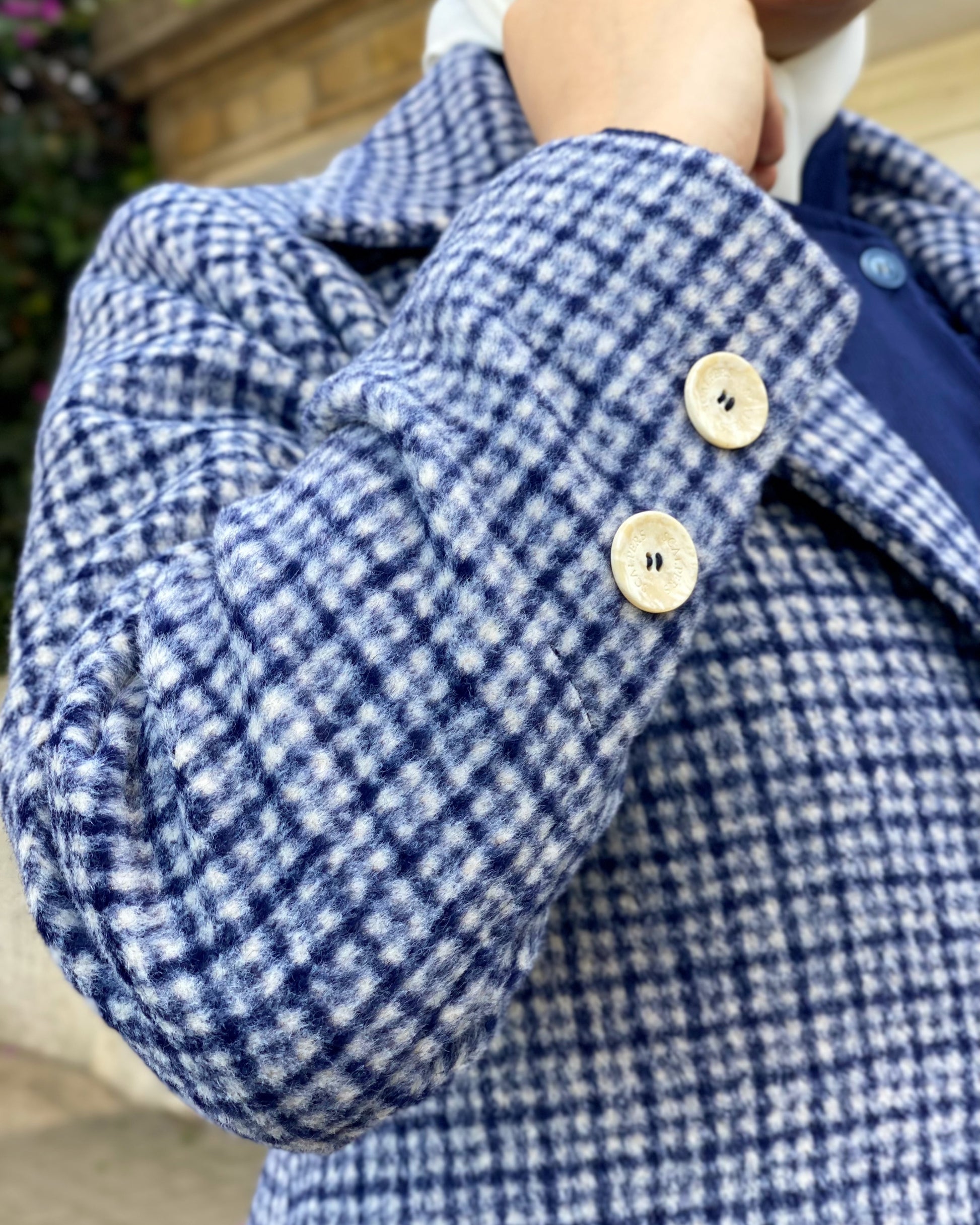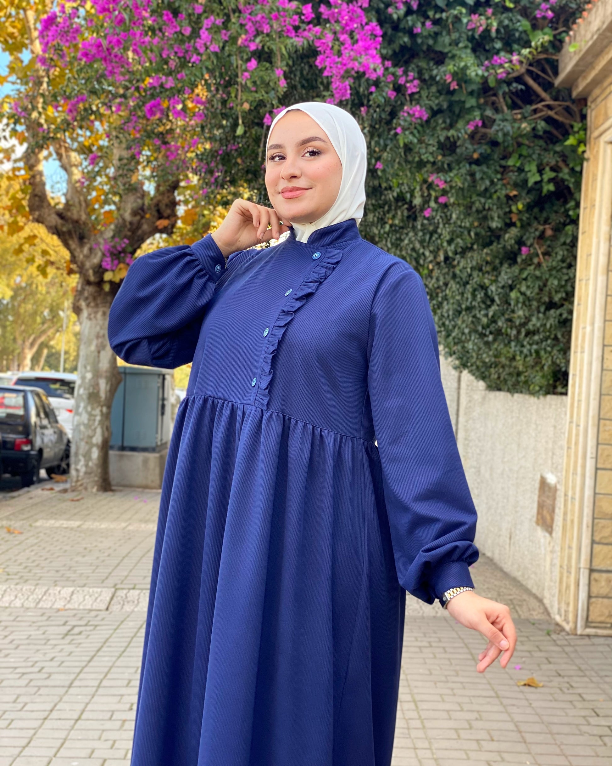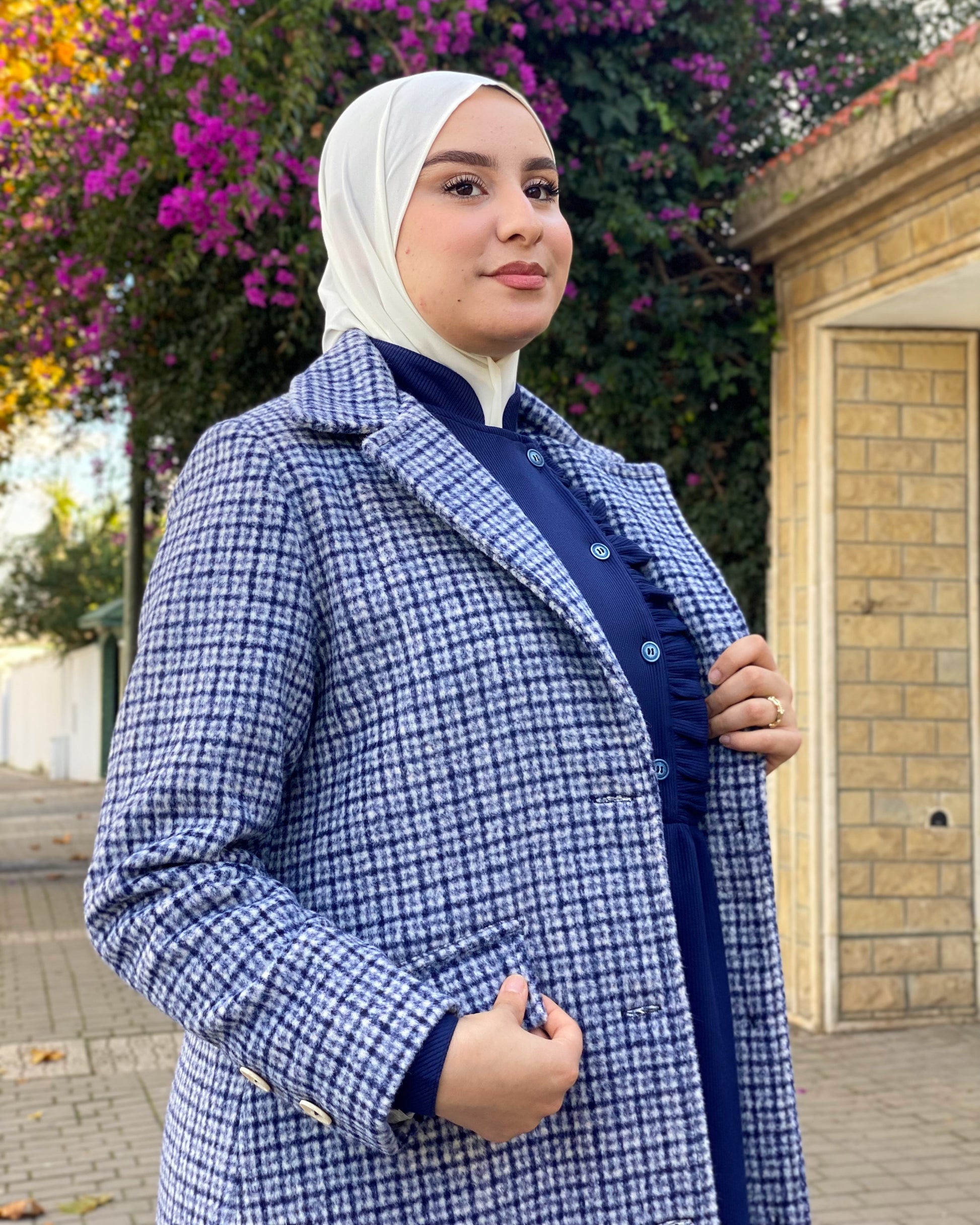 Avec son tissu bleu chaud mélangé à du blanc , le manteau ajoute une touche de chaleur et d'élégance à votre look et contient un doubleur. La robe bleue en velours chaud complète le look et vous fait vous sentir à la fois confortable et belle.