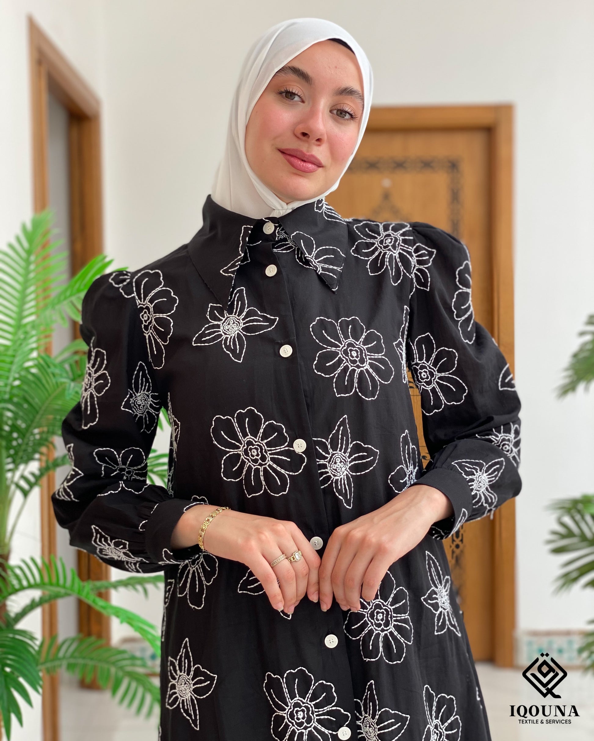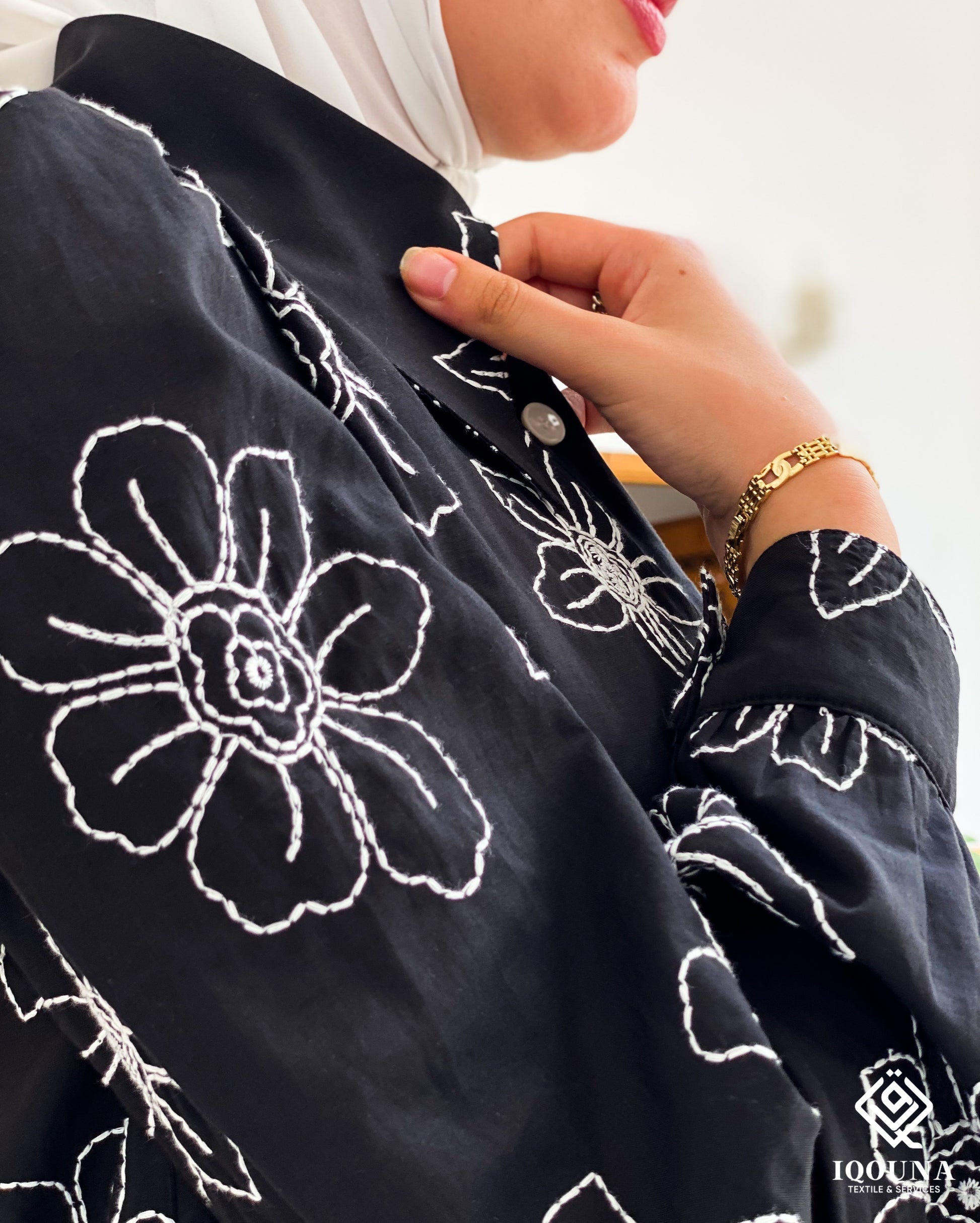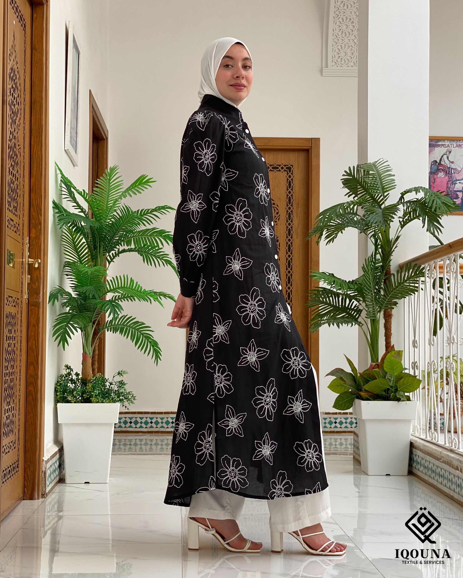 Le tissu est brodé en blanc et le pantalon est en lulan de première qualité.