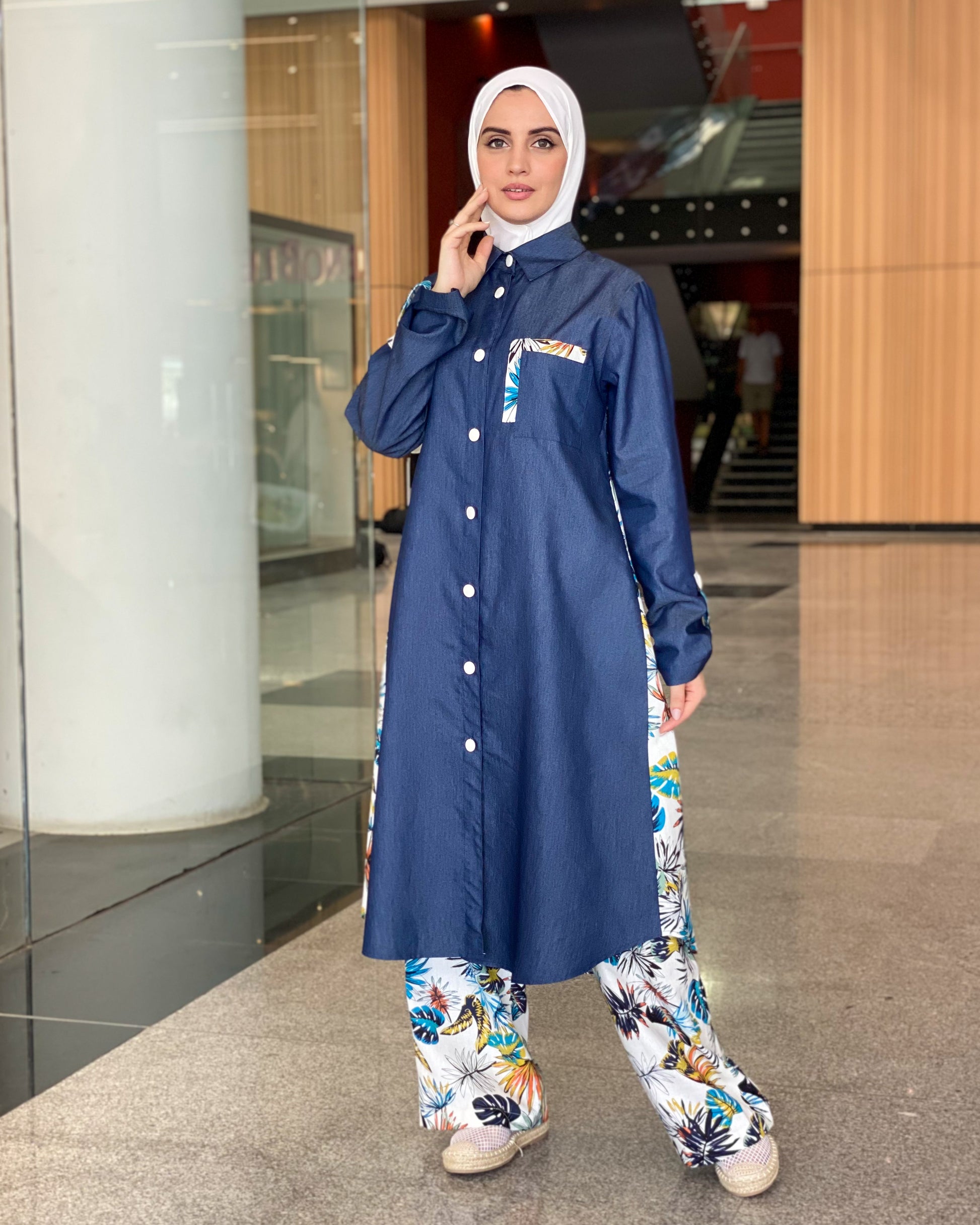 Comme nous vous l'avons promis, IQOUNA est la meilleure destination pour celles qui aiment la différence et l'élégance. Cette fois-ci, nous vous proposons cet ensemble élégant, modeste et confortable, qui vous accompagnera dans toutes vos sorties et sera idéal pour votre retour au travail. Cet ensemble est confectionné dans un tissu denim et un tissu Lolan d'excellente qualité.