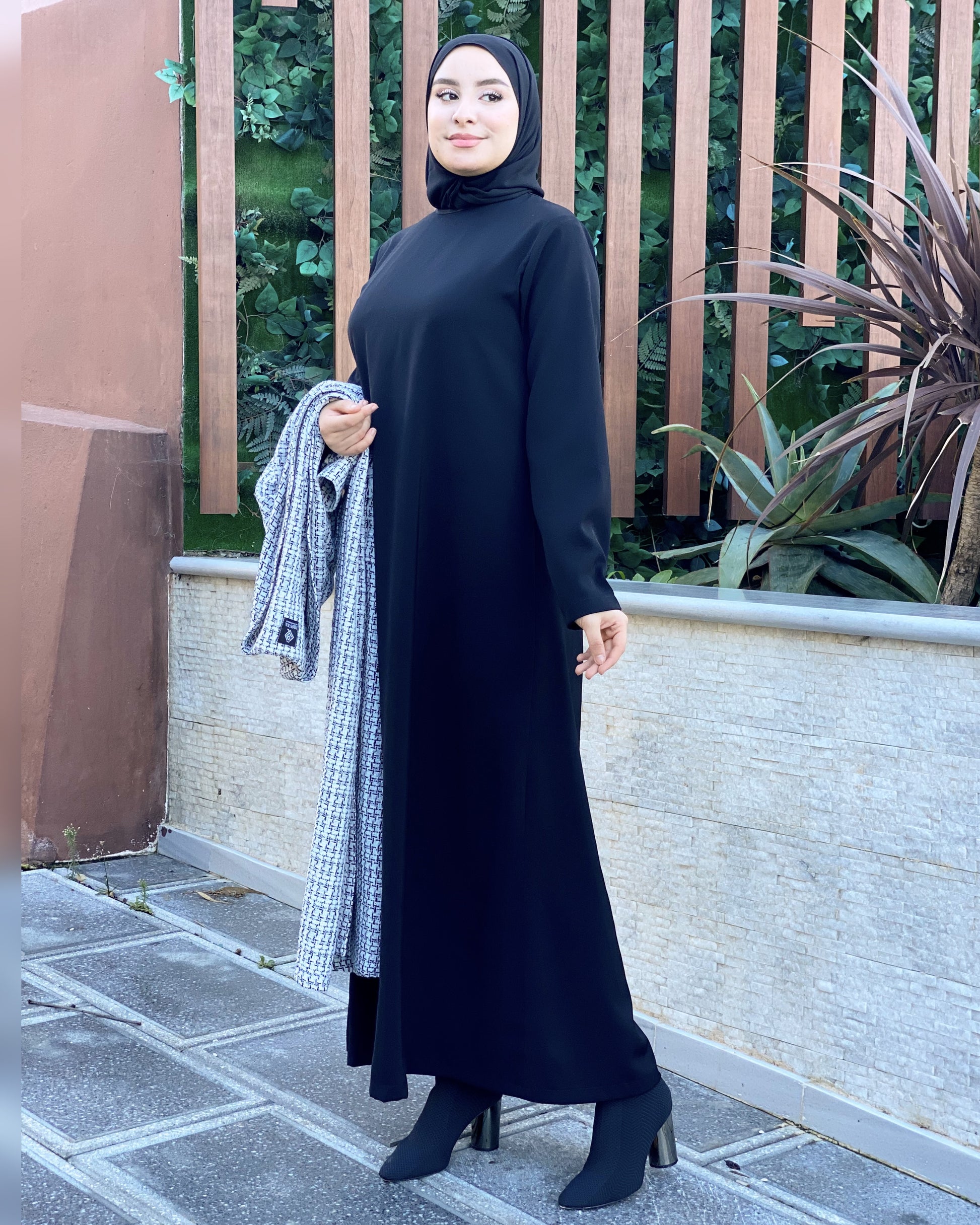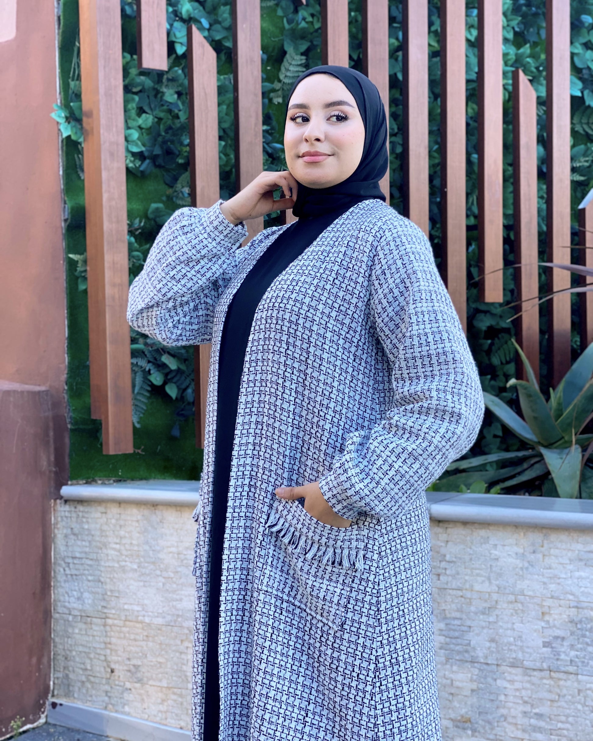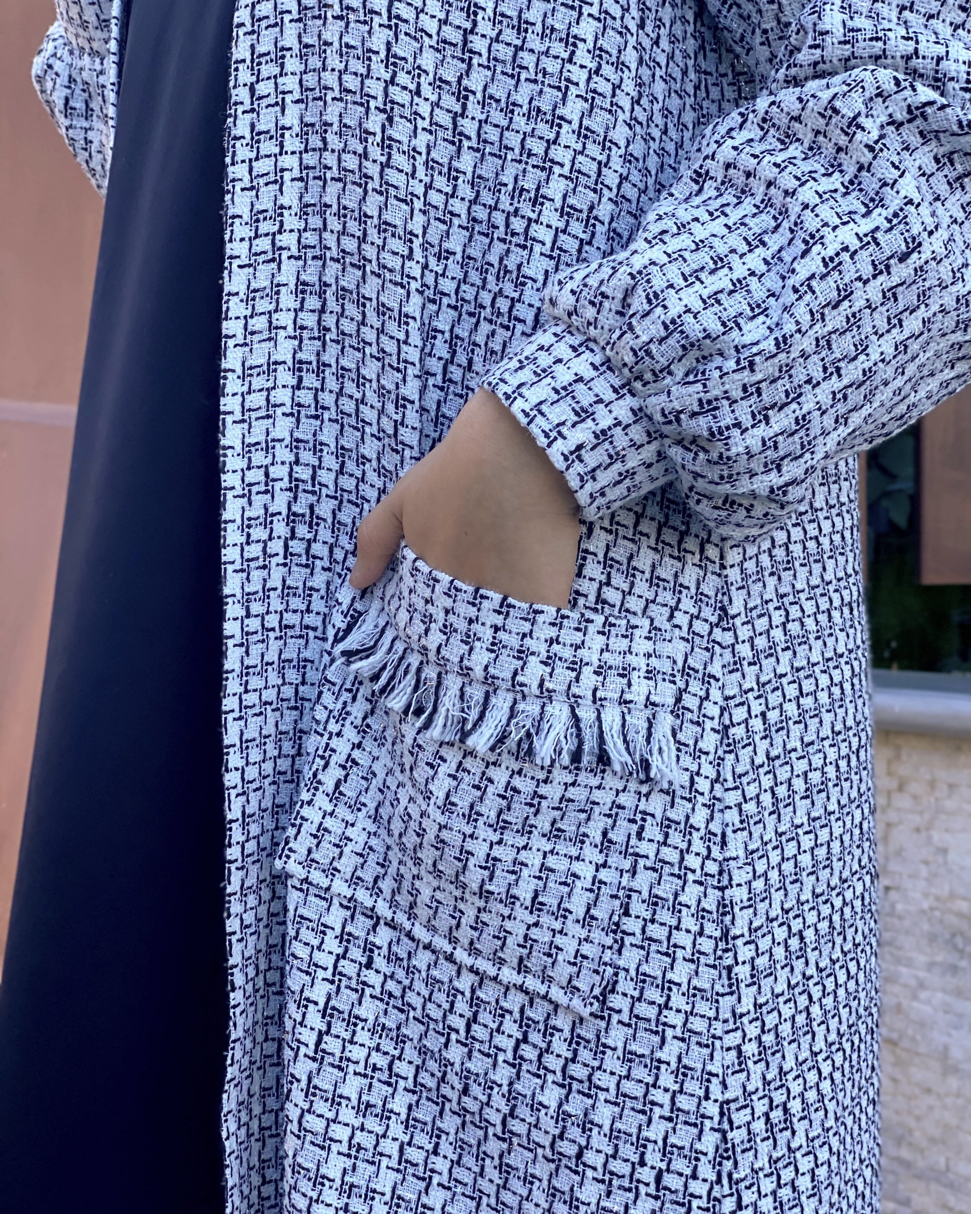 Composé de deux pièces, un kimono en tissu chanel d'excellente qualité et une robe en crêpe, les deux se marient pour créer un look classique, élégant et simple. Le blanc et le noir, les rois des couleurs, ajoutent une touche de luxe et de sophistication à votre look.